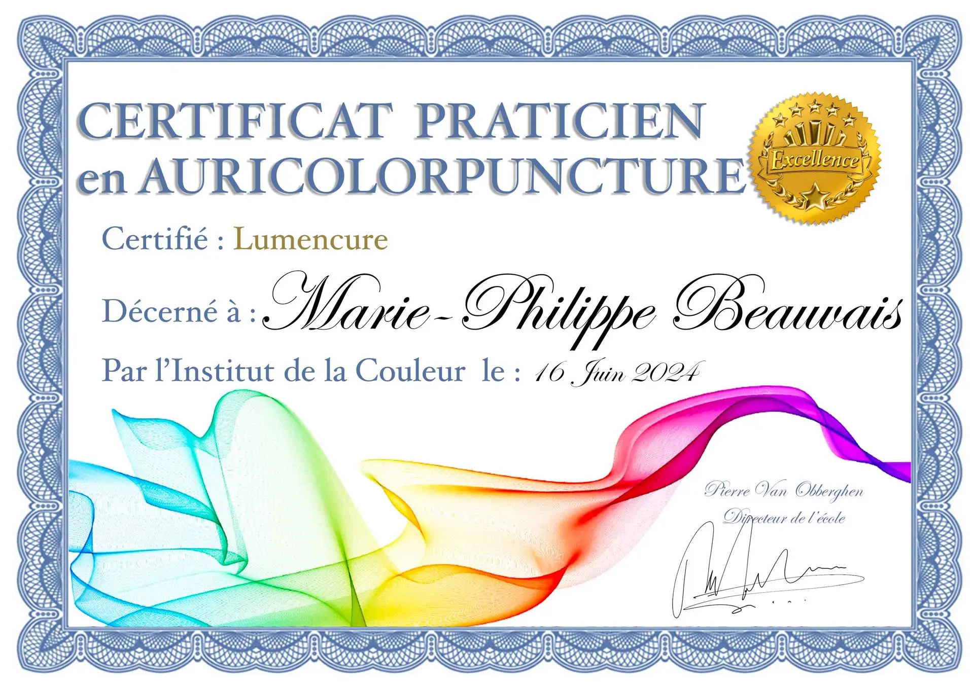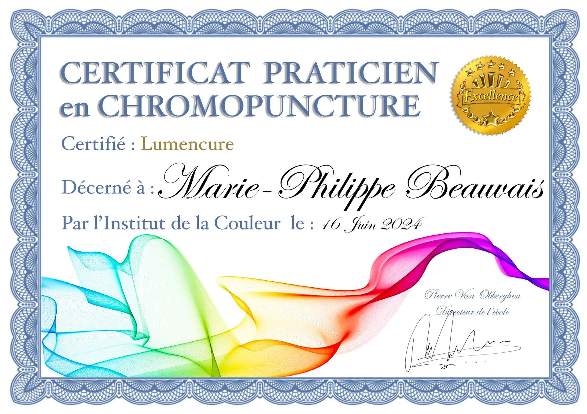 Ci-dessous, vous trouverez mes diplômes en Chromothérapie.
